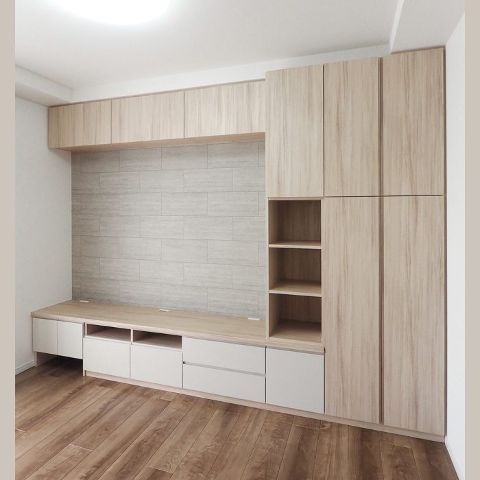 東京都新宿区のマンションに納品させていただいた壁面収納です。TVボードに加え、デスクスペースやガラスショーケースも組み合わせ、空間に溶け込む多機能な収納を実現しました。[…]