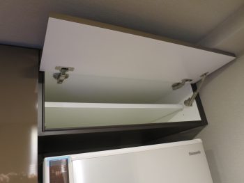 ・梁に対応した上開き扉の冷蔵庫上吊り戸棚を設置しました。
