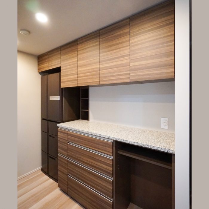 自分の希望が図面上で叶い、現実でも叶った食器棚!横浜市の新築戸建てに納品させて頂いた食器棚です。キッチンに合わせた石目調の扉と、1枚板の御影石天板がこだわりの食器棚です。見た目がスタイリッシュな食器棚ですが、収納力[…] - N.Y.様