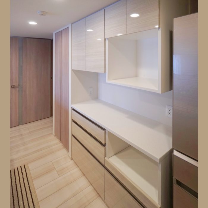 大阪府吹田市の新築マンションに納品をさせて頂いた食器棚です。お客様宅のキッチンから洗面室にアクセスできる水回り回遊式の間取りでした。その為、食器棚設置スペースには大き[…]