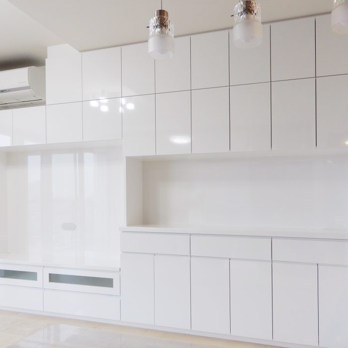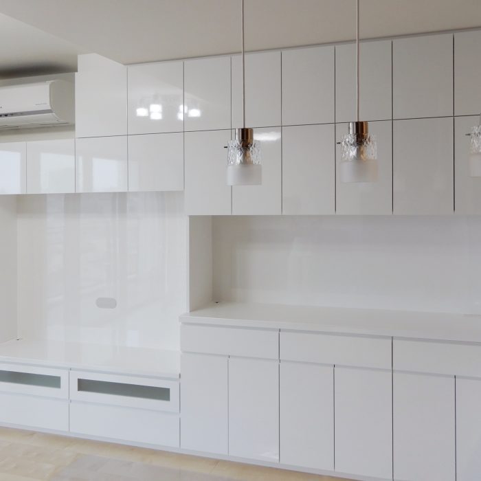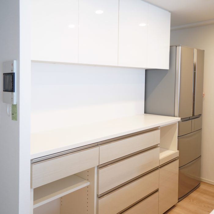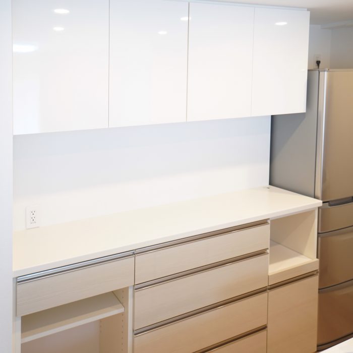相模原市のマンションに納品をさせて頂いた食器棚です。面材はシステムキッチンと合わせず、白色の鏡面をセレクトして頂きました。扉の面材はマンションの場合はシステムキッチン[…]
