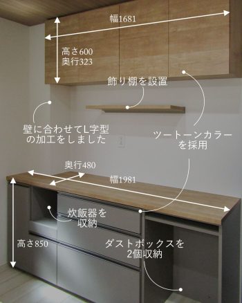 食器棚の設置場所には一部、壁が飛び出ている部分がありましたが、L字型の加工で隙間なく設置。