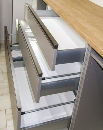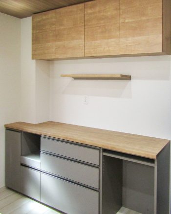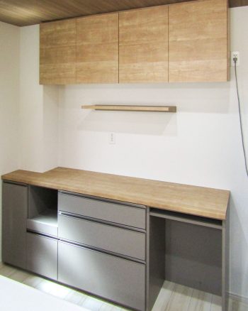 吊り戸棚と天板はオーク柄のナチュラル色、下台はグレージュ色の組み合わせです。