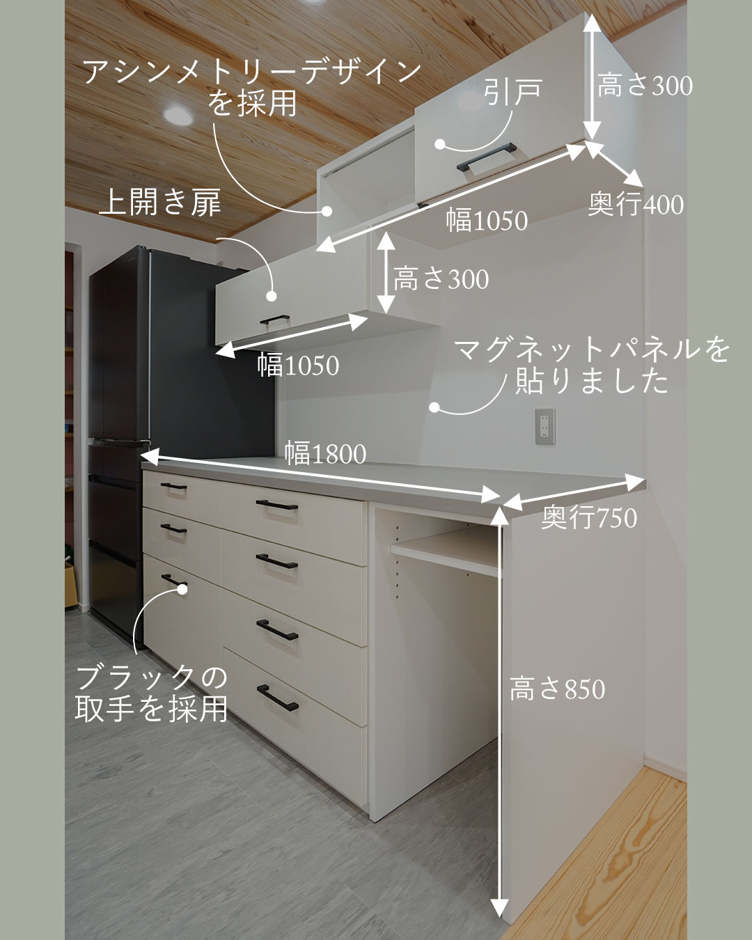 アンシンメトリーデザインを採用し、お客様の「こんな形の食器棚が欲しい」を実現することができました。