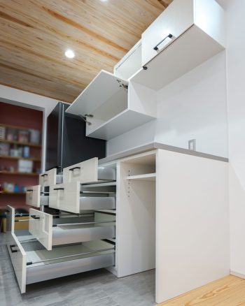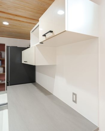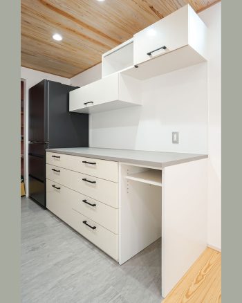 吊り戸棚は上開き扉と引き戸を組み合わせ、多様な使い勝手に対応しています。