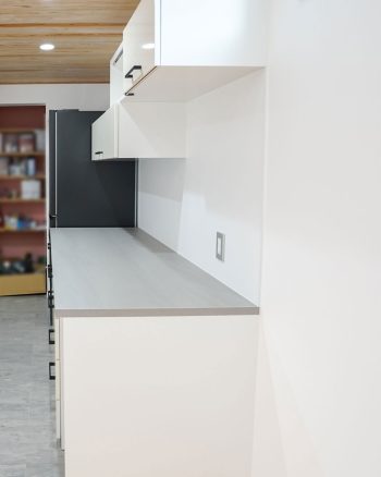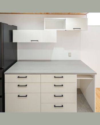 ホワイトのメープル柄扉にブラックの取っ手、天板のグレーモルタル柄の配色にもこだわりがあります。