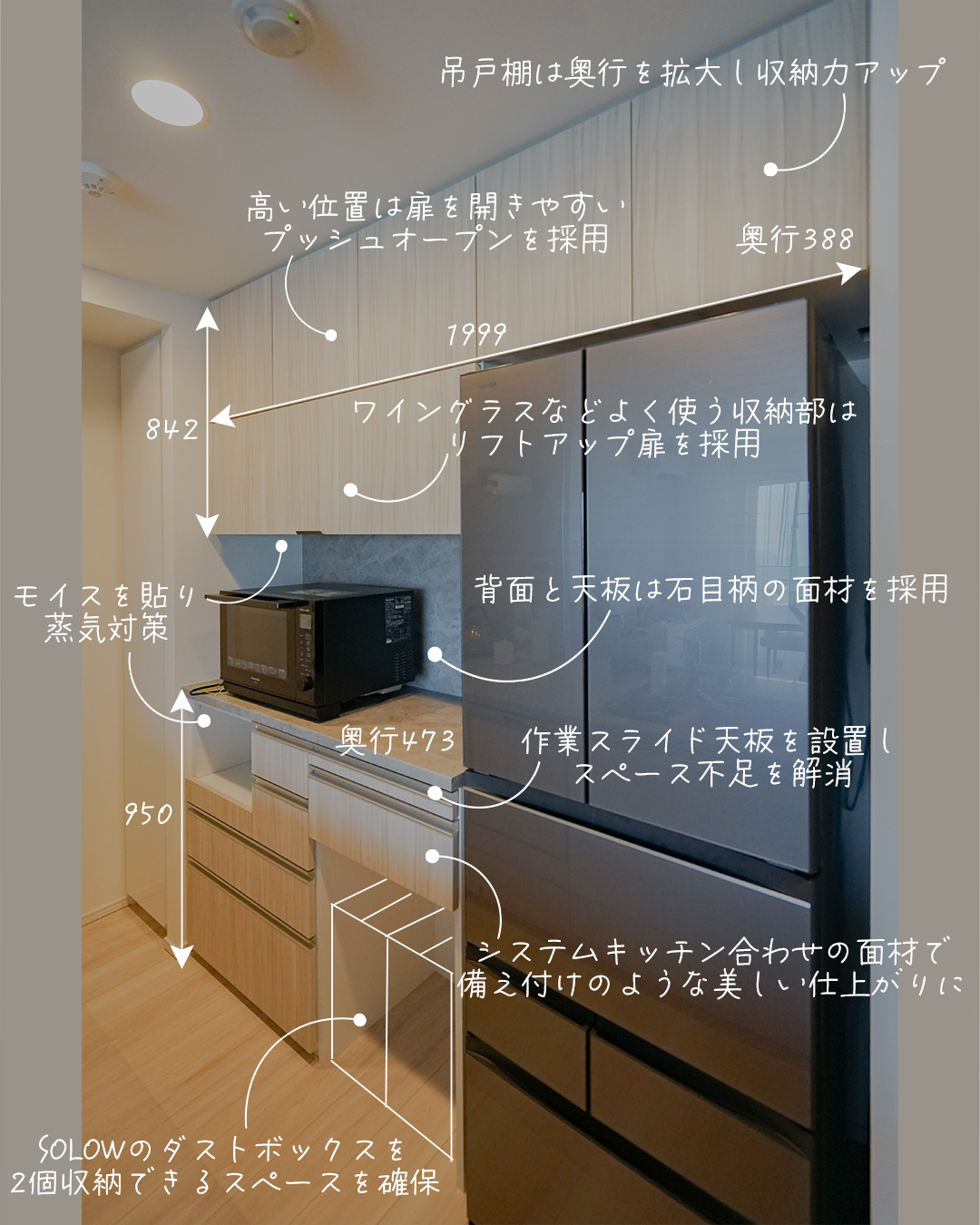 ・吊戸棚は奥行を広げ、収納力を強化