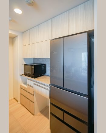システムキッチンと調和するデザインに加え、蒸気対策や作業スペースの確保など使い勝手にも配慮した仕様となっています。