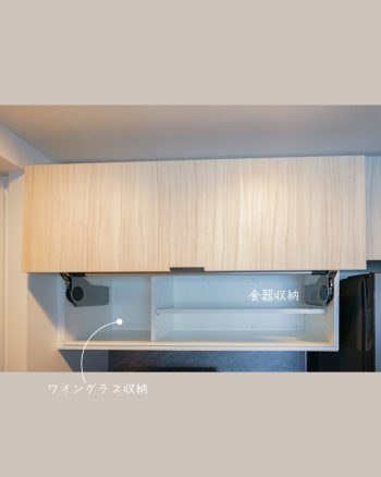 よく使うグラス類の収納にはリフトアップ扉を採用し、開けたままでも邪魔にならず作業しやすい設計に。