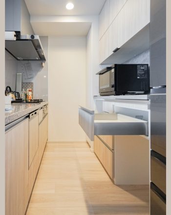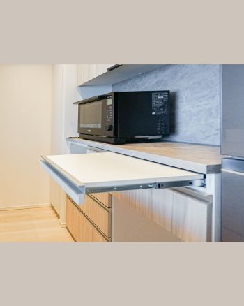 スライド式の作業天板も備え、スペース不足を解消しています。