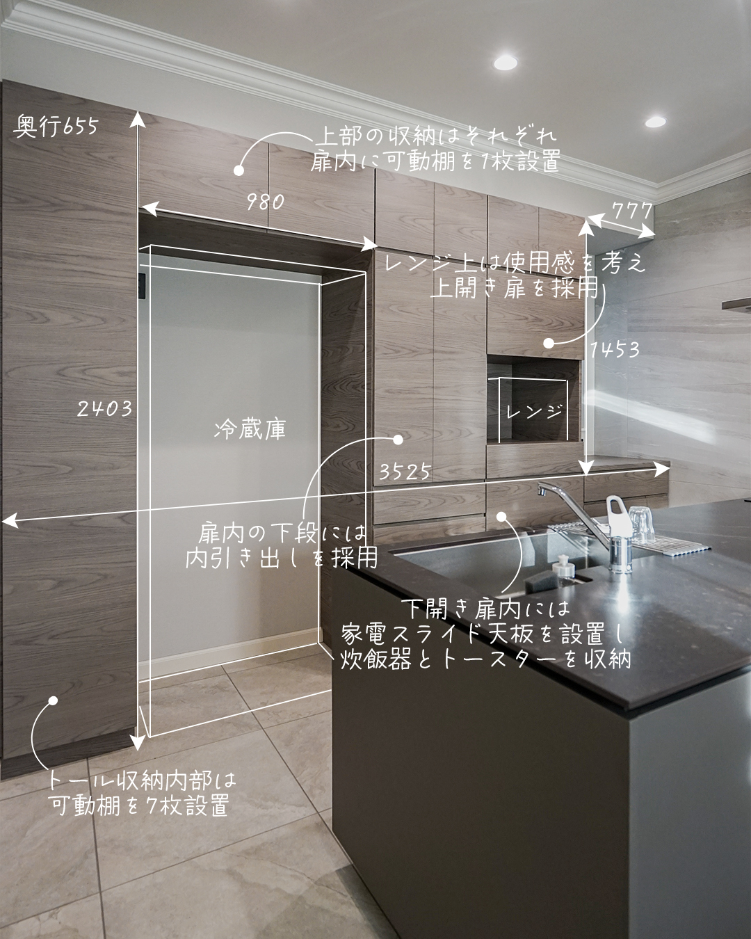 お米の保管用に12kg米櫃の寸法も確保するなど、細かなご要望を一つひとつ反映しました。