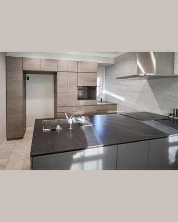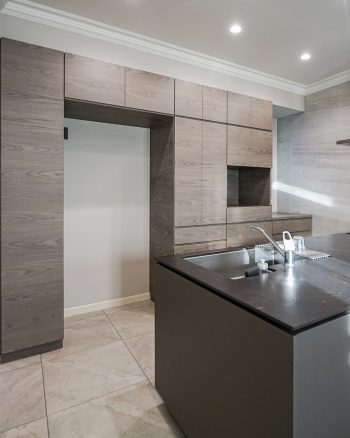 冷蔵庫と家電を含む幅3.5m以上の壁面全体を活かし美しい木目が通る意匠に仕上げています。