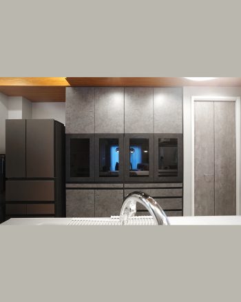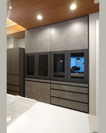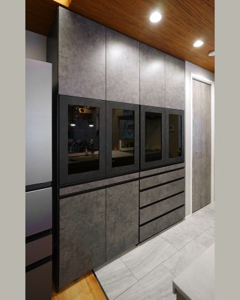 質感ある石目調の扉材をブラックのガラスフレームを組み合わせることで、落ち着いた印象を与えながらも、空間全体にメリハリをつけています。