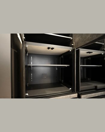 中央部にはスライドイン式のブラックガラス扉を採用し、デザインのアクセントに。