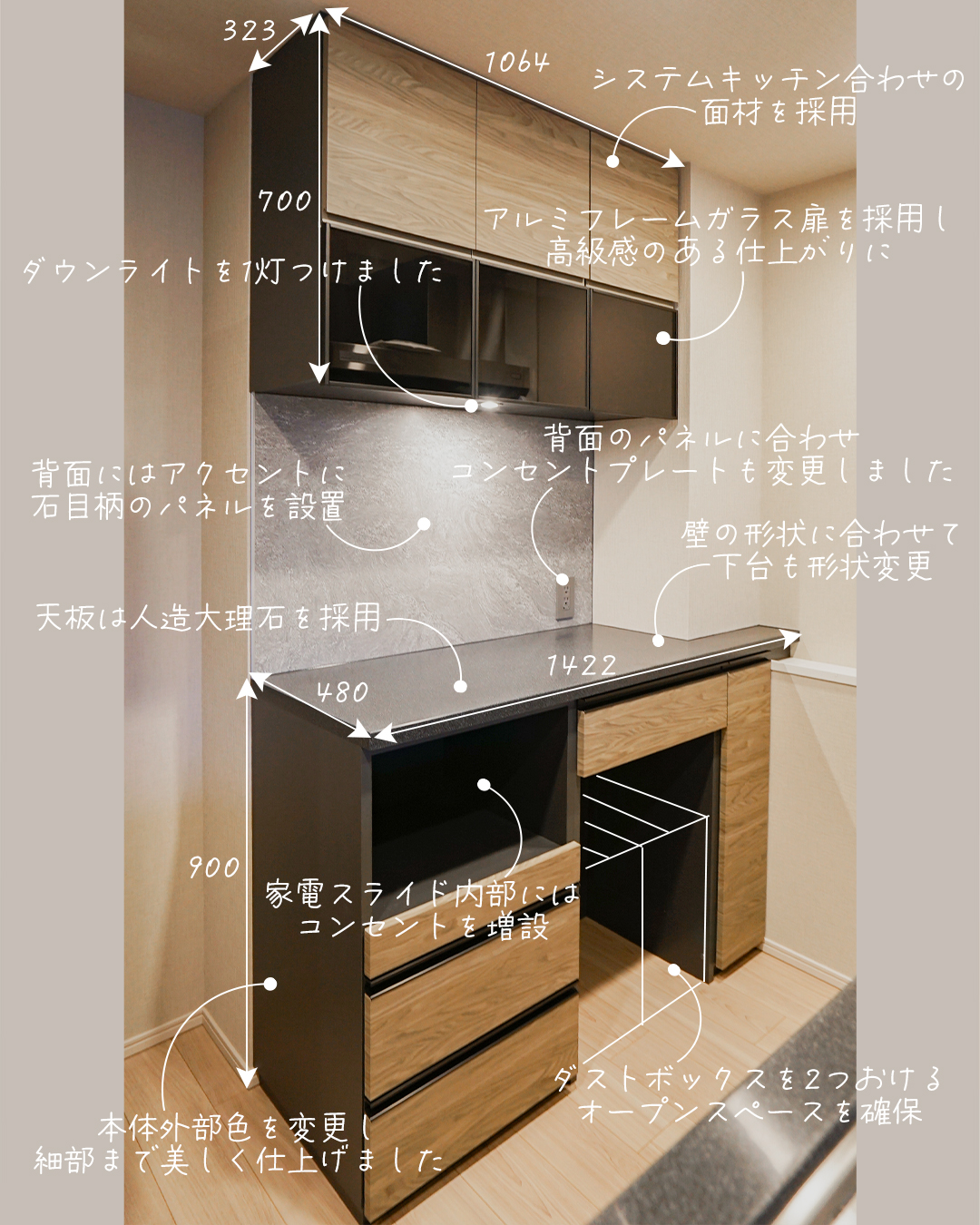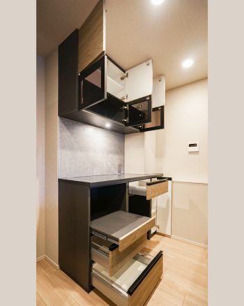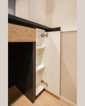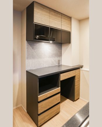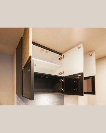 壁面の形状に合わせた加工も施し、無駄のない美しい納まりを実現しました。上部にはブラックのアルミフレームガラス扉を採用し、収納力を確保しながらも圧迫感を感じさせない、すっきりとしたデザインにまとめました。