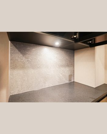 背面には石目調のパネルを施工し、空間全体に高級感をプラス。