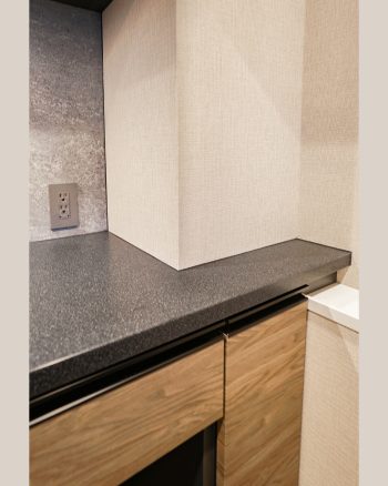 天板には人造大理石を採用し、お手入れのしやすさと重厚な質感を両立。家電用スライド天板内部にはコンセントを増設し、炊飯器やケトルの使用時にもスムーズに対応できる仕様となっています。