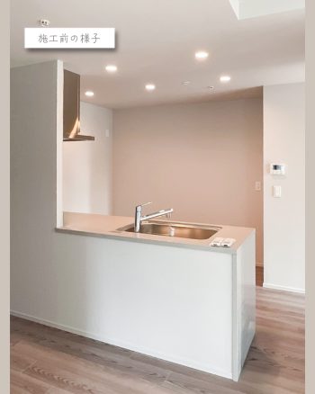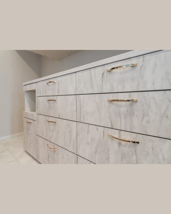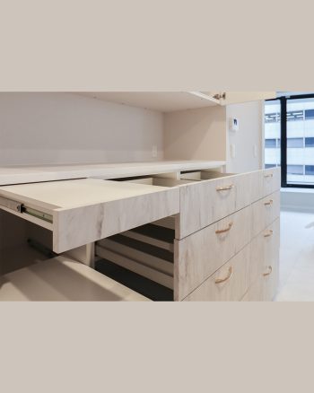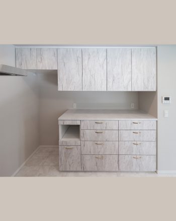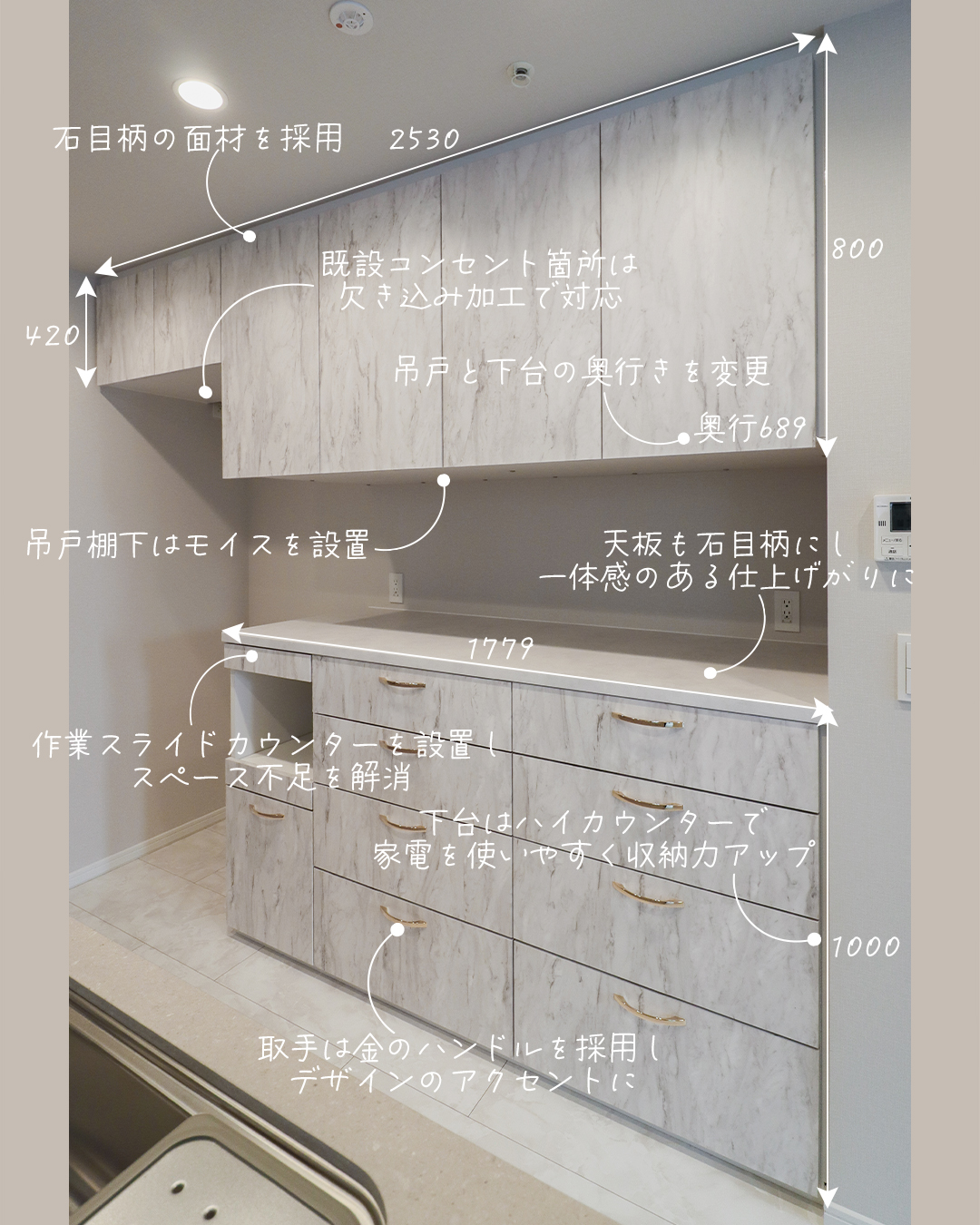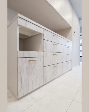 石目柄とゴールドの取手がアクセントとなり、キッチン空間に華やかさと上質感を添えるデザインに仕上がりました。