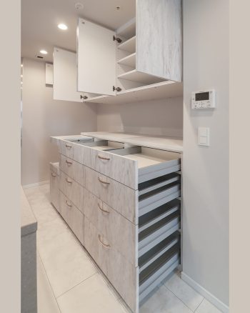 空間の主役として視覚的な存在感を放つ食器棚は、全面に石目柄の面材を採用することで、自然な風合いと奥行き感を演出しています。