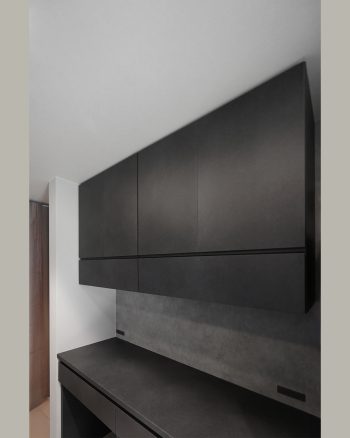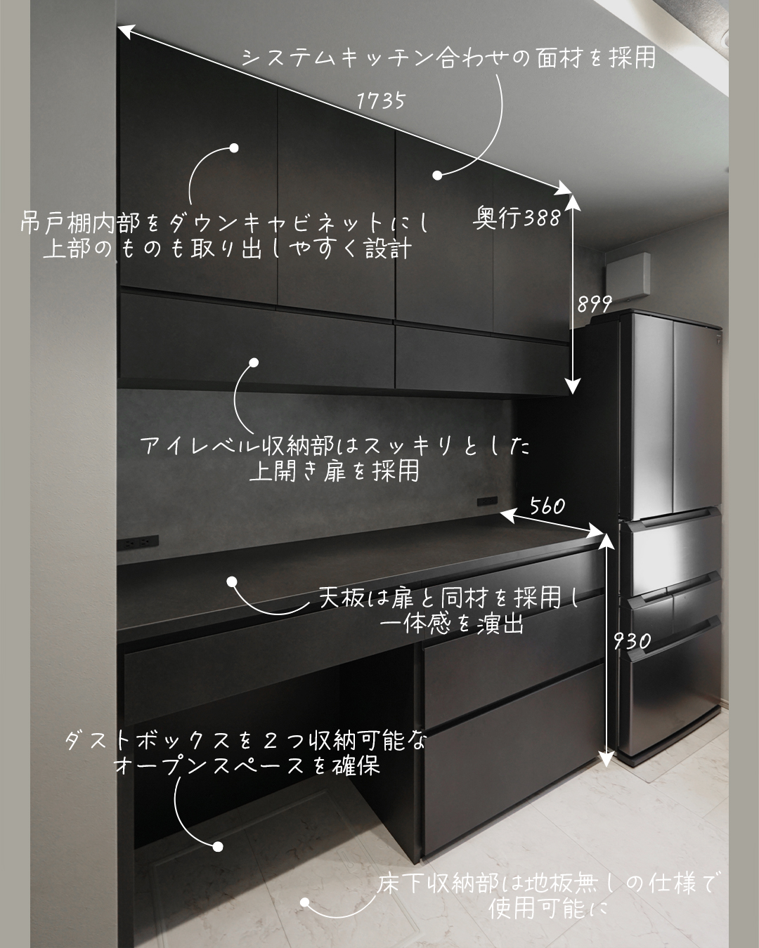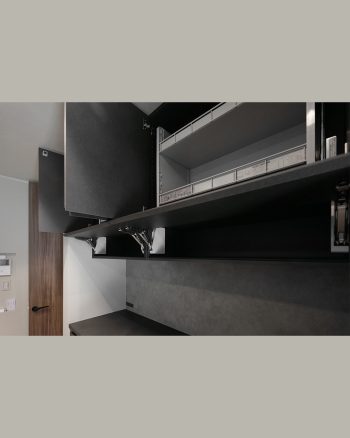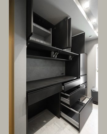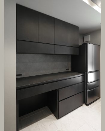 天板には扉と同素材を使用し、ブラックで統一された印象的な仕上がりに。
