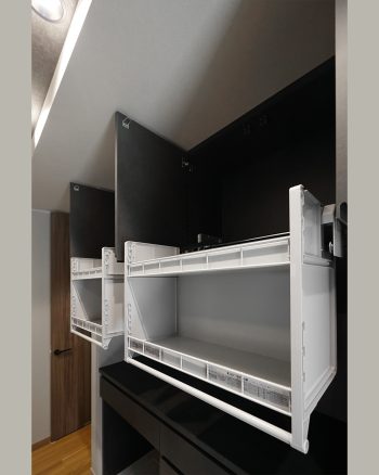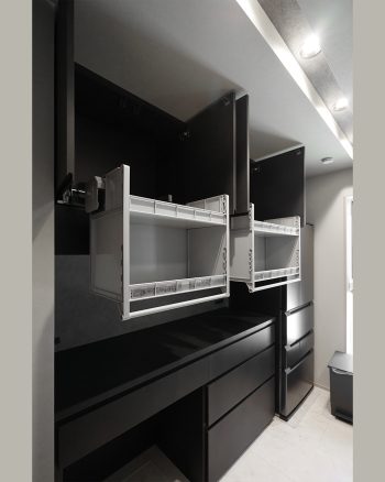 吊戸棚の内部はダウンキャビネット仕様で、上部まで収納があっても手が届きやすいよう工夫されており、収納力と使い勝手を両立。