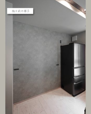 システムキッチンと面材を統一し、空間に一体感と重厚さを演出しました。