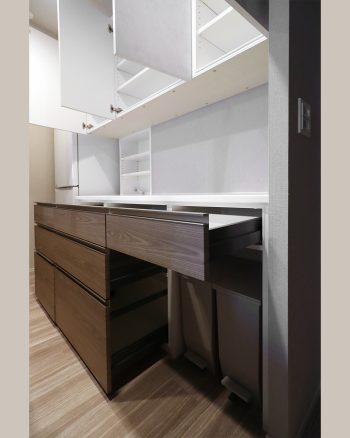 上段の浅い引き出しにはカトラリーやキッチンツール、下段の深い引き出しには食品ストックや調理器具を収納できるよう設計しました。