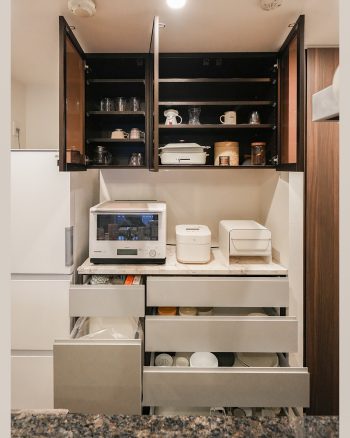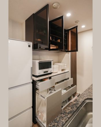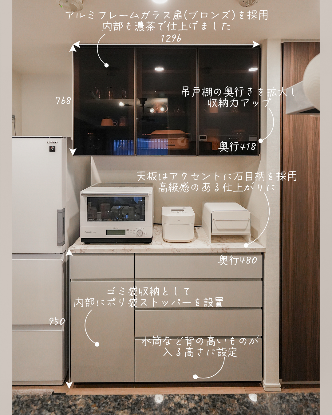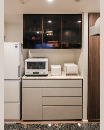 ブロンズカラーのガラス扉と石目柄の天板を組み合わせ、上質感と収納力を両立させたキッチン収納に仕上げました。
