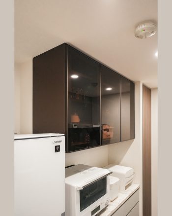 上部の吊戸棚には、ブロンズカラーのアルミフレームガラス扉を採用しました。