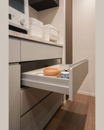 また、吊戸棚は奥行きをしっかり確保することで、食器やキッチン用品を効率よく収納できる設計としました。