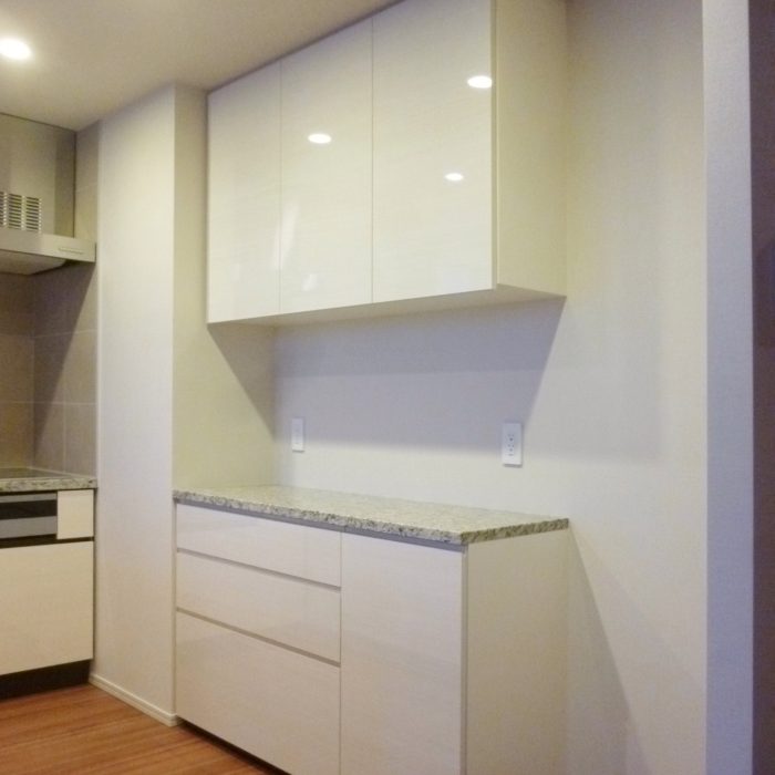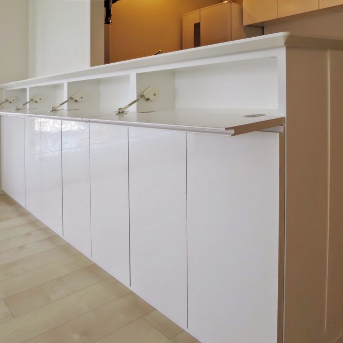 東京都の新築マンションに納品させていただいたカウンター収納です。マンションはカウンター型キッチンで作られていることが多いですがどうしても収納が足りないところ。ダイニン[…]