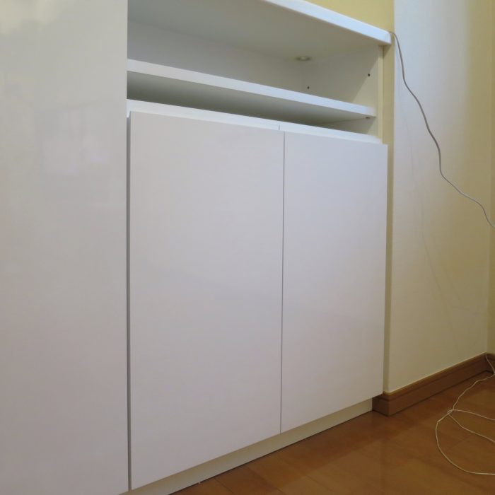 埼玉県の新築マンションに納品させていただいたカウンター収納です。白い本体色に、扉材は白木にしています。キッチンカウンター、壁紙の白と合わせることで溶け込んでいます。上[…]