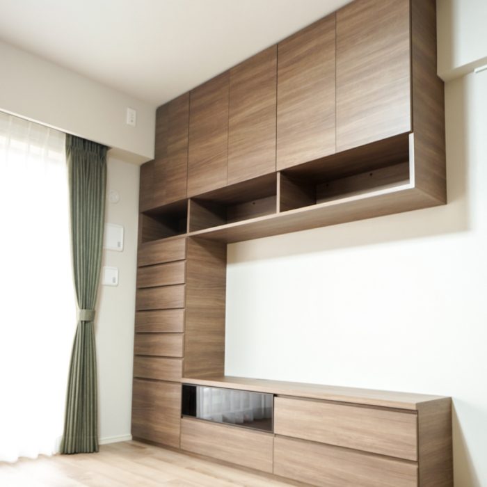 川崎市幸区の新築マンションに納品させて頂いた壁面収納です。壁幅の約半分を家具の設置スペースとしましたが、アンシンメトリーデザインを採用しました。テレビ設置位置をメイン[…]