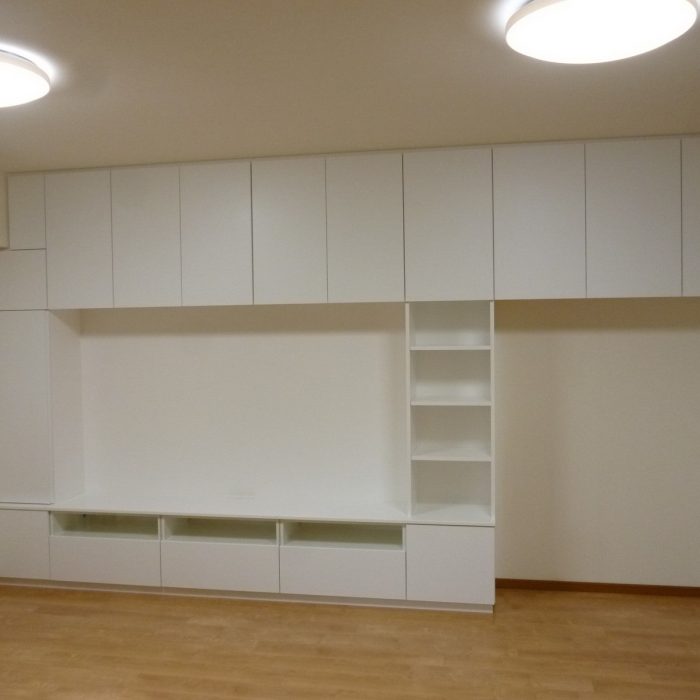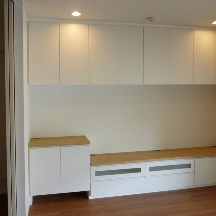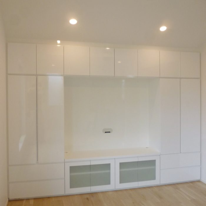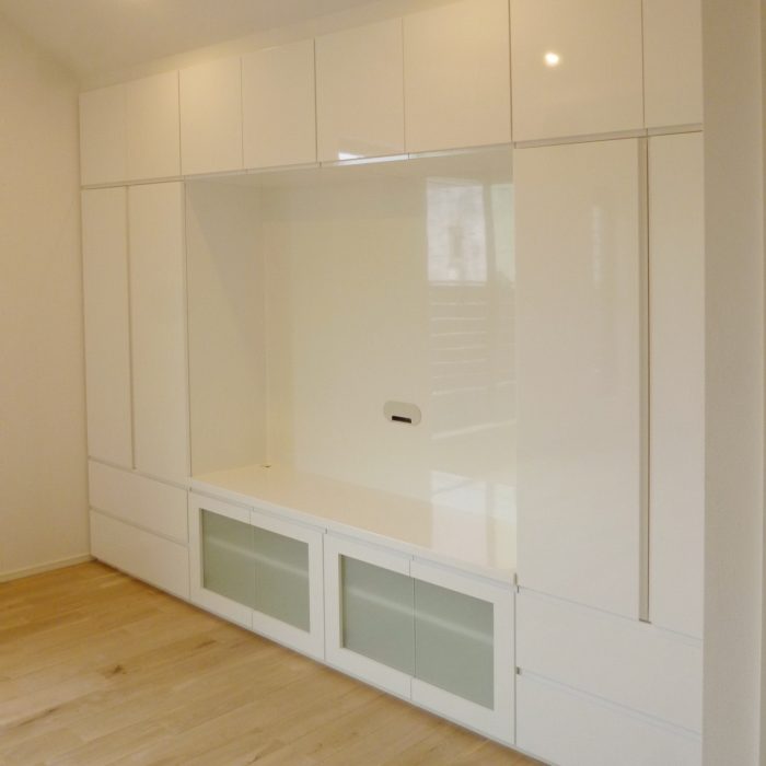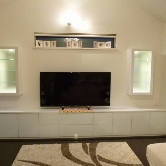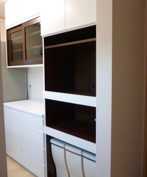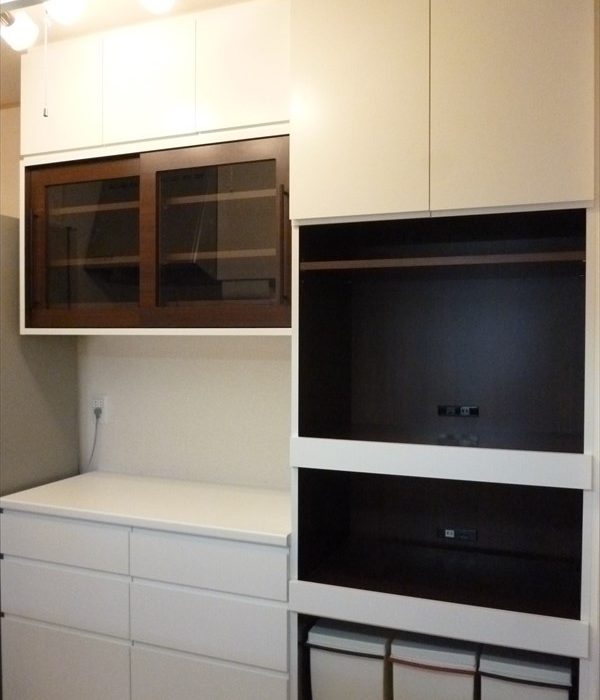 東京都の新築戸建てに納品させて頂いた食器棚です。外観は白を基調とし、オープン部とガラス引き戸部分は木目を使用。2トーンカラー、食器・家電、大きく2つの構成で計画的ピッタリ[…]