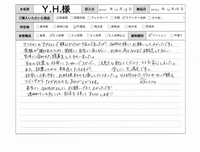 マンションのオプションで頼むかどうか悩んでましたが、GNASH様にお願いしてよかったです。食器が趣味のため、実際に自宅に来てもらい、生活に合わせた提案をしてもらいました。当日の設置も非常に丁寧でスピーディー、注意点も教えてくださり、とても安心しました。また、設置してから半年近くたちますが、全てに満足です。非常に使いやすく、お料理するのも楽しくなりました。収納されたお気に入りのグラスやカップ類をリビングからながめるのも気分が上がります。本当にGNASHさんにお願いできてよかったです!迷われている方には、自信を持ってオススメします!!