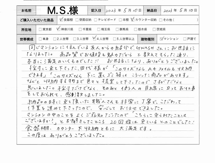 2023年5月10日 / M.S.様の声 使う人の目線に立ってお仕事をしておられて、感激しました