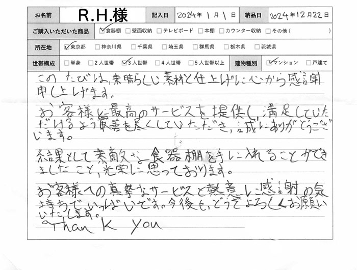 このたびは、素晴らしい素材と仕上げに心から感謝申し上げます。お客様に最高のサービスを提供し、満足していただけるよう最善を尽くしていただき、誠にありがとうございます。結果として素敵な食器棚を手に入れることができましたこと、光栄に思っております。お客様への真摯なサービスと熱意に感謝の気持ちでいっぱいです。今後も、どうぞよろしくお願い致します。Thank you.