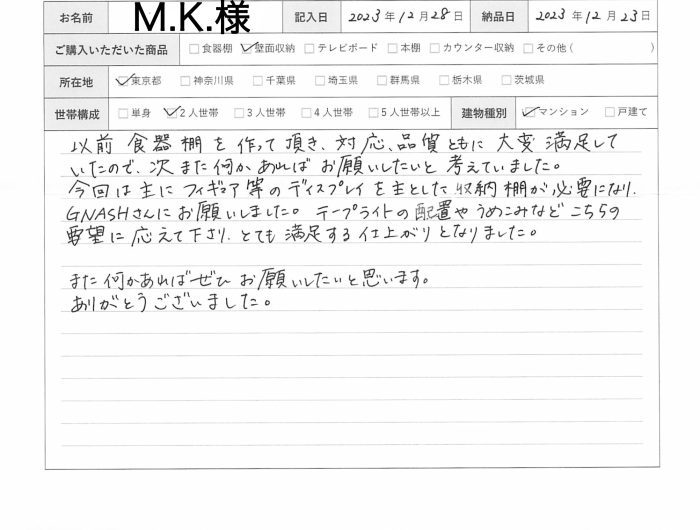 以前食器棚を作って頂き、対応、品質ともに大変満足していたので、次また何かあればお願いしたいと考えていました。今回は主にフィギア等のディスプレイを主とした収納棚が必要になり、GNASHさんにお願いしました。テープライトの配置やうめこみなどこちらの要望に応えて下さり、とても満足する仕上がりとなりました。