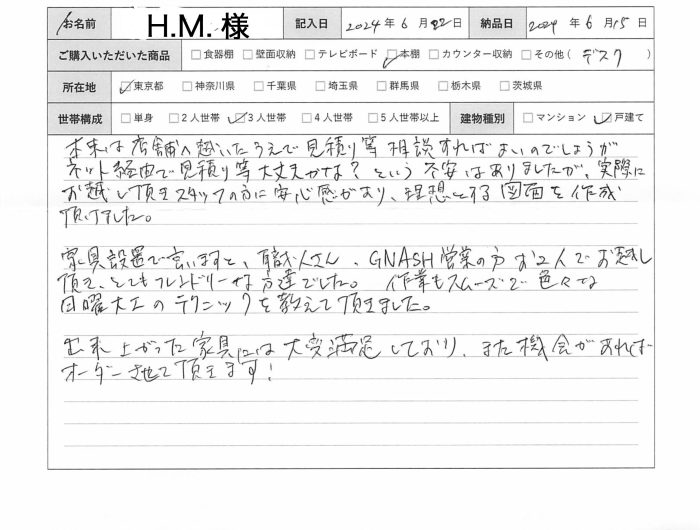 出来上がった家具には大変満足しており、また機会があればオーダーさせて頂きます!