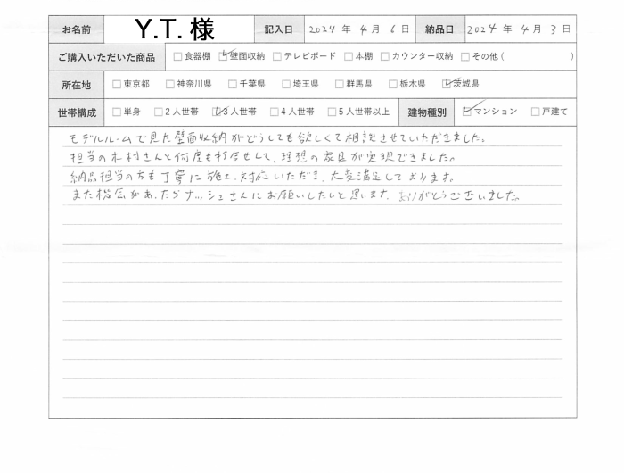 モデルルームで見た壁面収納がどうしても欲しくて相談させていただきました。担当の木村さんと何度も打合せして、理想の家具が実現できました。納品担当の方も丁寧に施工、対応いただき、大変満足しております。また機会があったらナッシュさんにお願いしたいと思います。ありがとうございました。