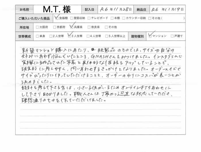 新築マンション購入にあたり、既製品のものでは、サイズや自分の好みにあわず悩んでいたところ、GNASHさんをみつけました。インスタグラムに実際に納品された写真と具体的な値段をアップしていることで、現実的に考えやすく、問い合わせするきっかけとなりました。オーダーメイドでサイズぴったりに作っていただけることと、オーダーのわりにコスパが良いことが決め手でした。設計を考えて下さる方は、小さい子供がいるためオンライン打ちあわせにして下さり助かりました。職人さんは丁寧かつ迅速な対応していただき、理想通りのものを作っていただけました。