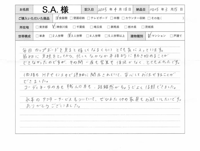 毎日カップボードを見ると嬉しくなるくらいとても気に入っています。最初に見積をとってから、忙しくなかなか本格的に動き始めることができなかったのですが、その間一度も営業や催促がなく、とてもよかったです。