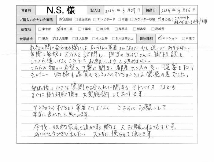 2025年3月16日 / N.S.様の声 細かい希望を丁寧に聞き、都度センスの良い提案を下さりました