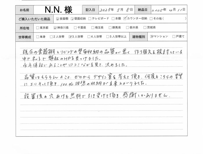 既在の食器棚とリビングの壁面収納の品質が悪く、作り替えを検討している中でネットで弊社のHPを見つけました。永年保証であることや口コミなどを見て、決めました。