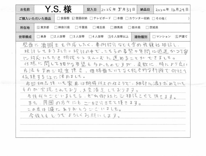 2024年12月24日 / Y.S.様の声 期待以上の仕上がりで、細部に渡り求めていたものが実現
