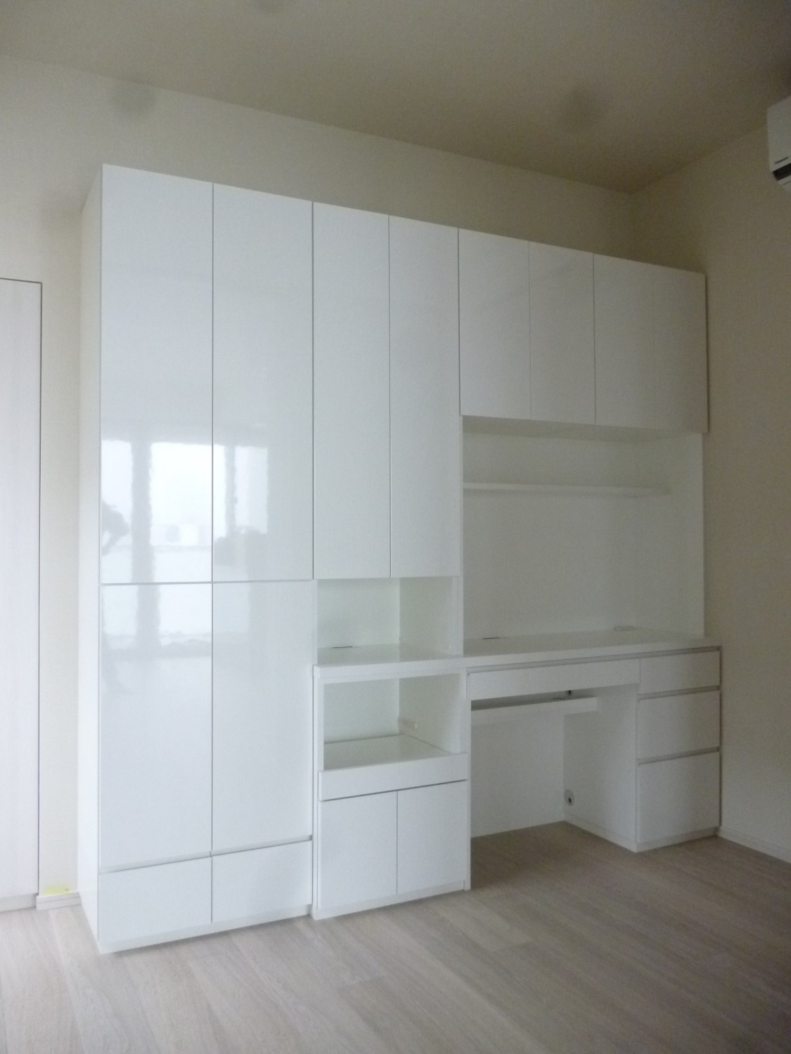 壁面収納同様、白色鏡面の面材を使用し、仕事部屋なので明るい雰囲気を出すことを優先としました。