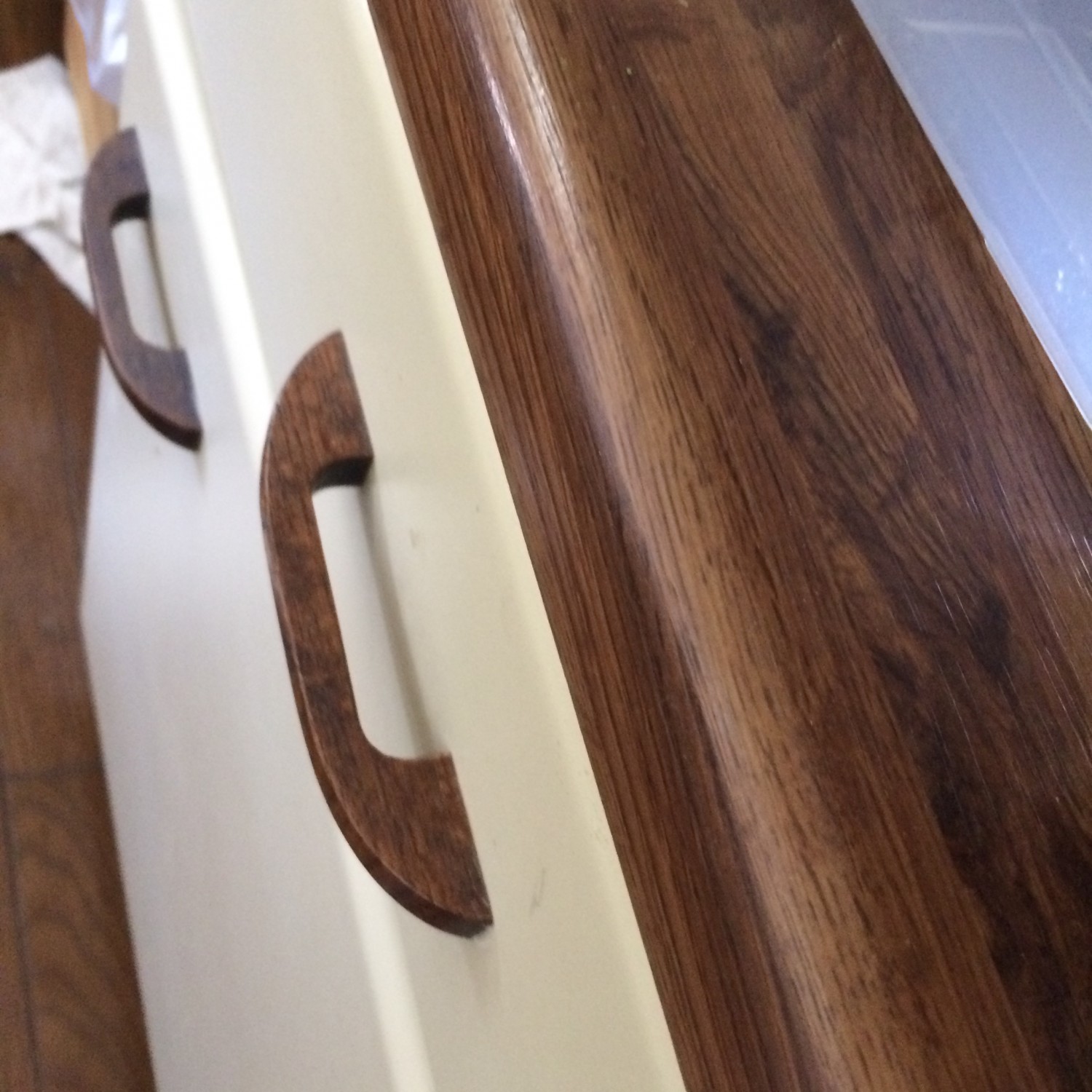 既存の天板に近い面材を選んで頂き、取っ手はキッチンという場所柄