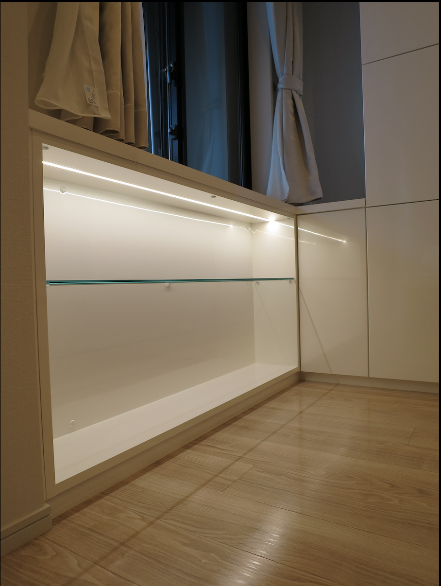 窓下部分は扉のないオープン棚、強化ガラスの固定棚を付け