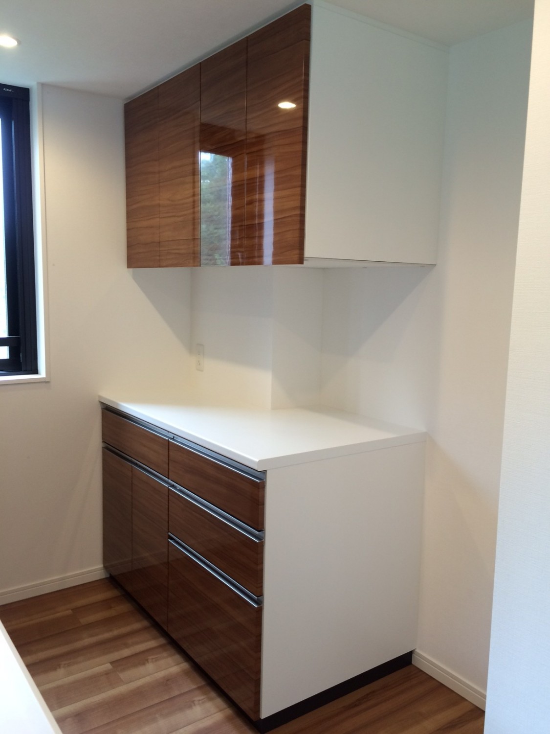 扉、取っ手はシステムキッチンと面材合わせ、