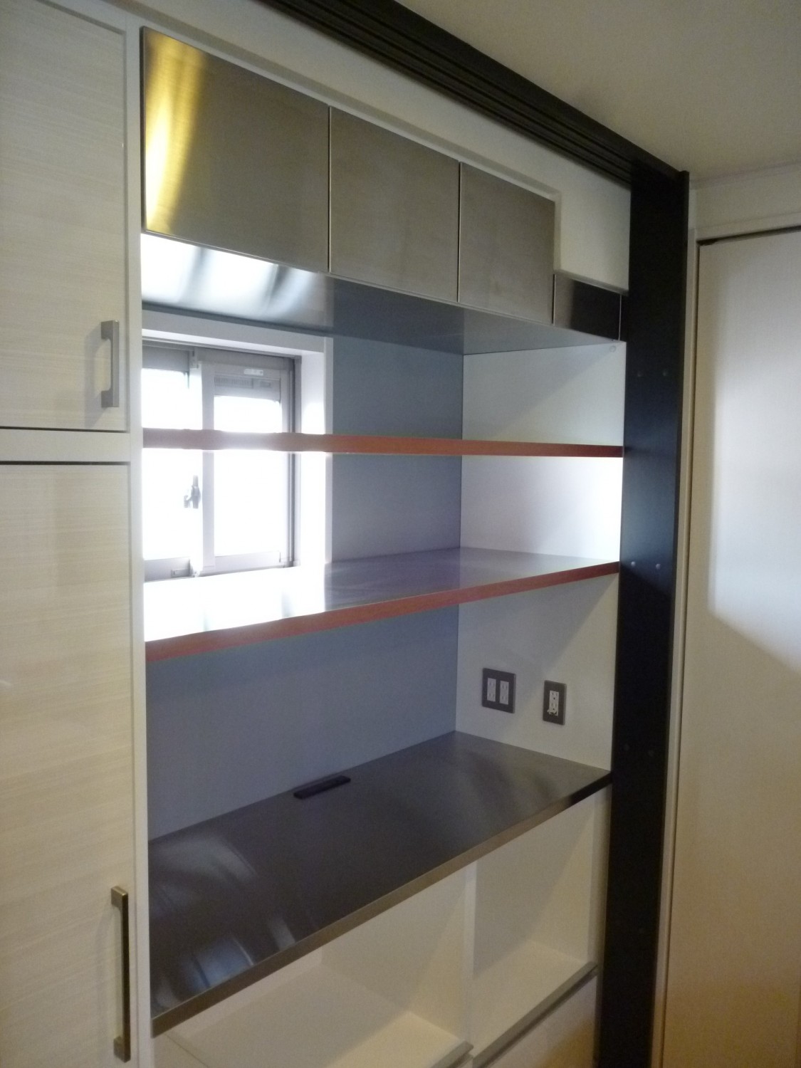 窓周りのクロスを張り替え、固定棚正面と下端はチェリーの木目、天板と固定棚上端、吊り戸棚にはステンレスを貼りました。ステンレス貼りもコストはかさみますが、今回の外せないポイントでした。